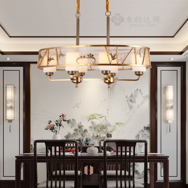 新中式餐厅吊灯9211布艺全铜长餐桌圆形原创意灯